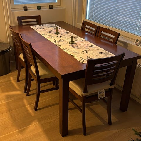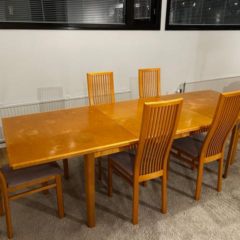 Kaksi tuoleista notkuu / jalka halki. Korjattavissa ilmeisen helposti.
