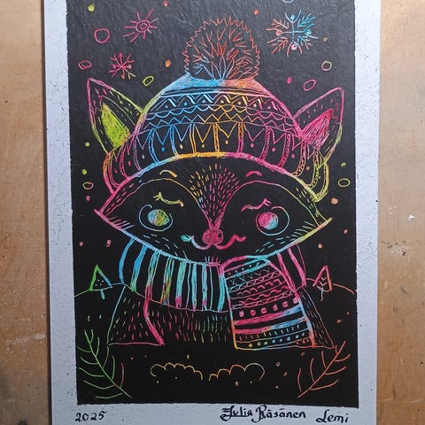 Grattage tekniikalla maalaus. Koko A5. Paperin vahvuus 200gsm.