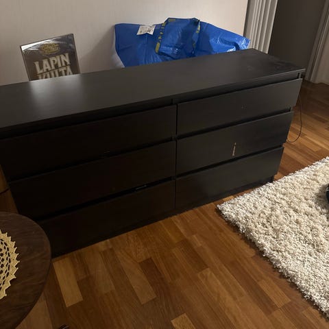Annetaan hieman rikki mennyt Ikea Malm lipasto. Yksi lista alimman laatikon yläpuolelta irronnut. Laatikko menee kiinni, mutta vähän ”irvistää”. Vain nouto.