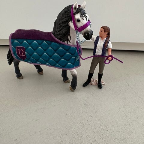 Myynnissä muitakin Schleich-ratsastajia, hevosia ja varusteita.