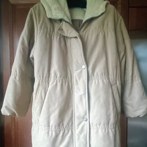 Huputon vanullinen talvitakki, väljempää mallia. Käytetty muutaman kerran. Voin lähettää kulut ostajalle.