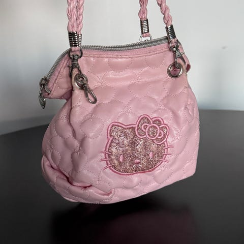 Hello Kitty meikkilaukku / meikkipussi. Tekonahkaa. Väri: vaaleanpunainen / pinkki, kullanvärinen ja musta. 17 cm x 15 cm x 4 cm. Erittäin hyvässä kunnossa. Hinta: 16 euroa (sis postin).