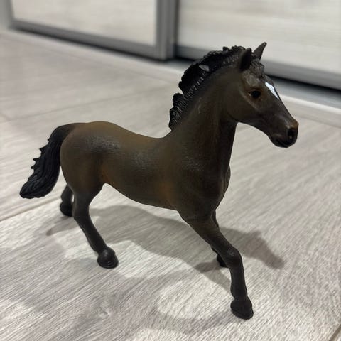 Myynnissä muitakin Schleich-ratsastajia, hevosia ja varusteita.