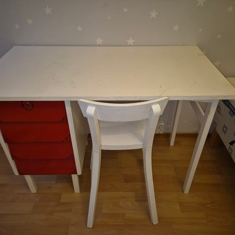 Siisti pöytä, vaikkapa opiskelijalle. Tuoli muuten kunnossa mutta verhoilu kulunut.