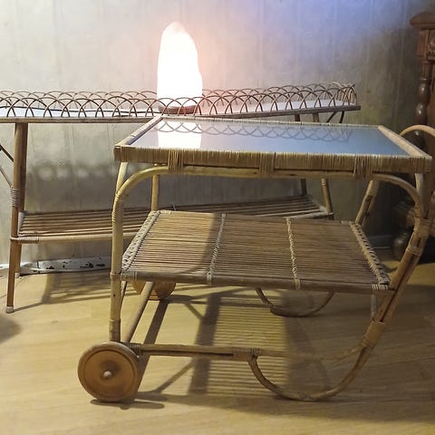 Madam Stolz, Stockmann mallistoa. Rottinkinen kukkapöytä. Vintage tyyliä, tehty vanhan oloiseksi. Mitat noin mittoja. Taustan laatat 10x10cm.