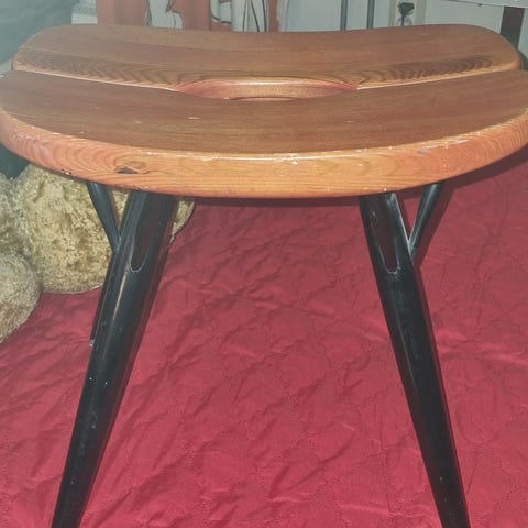 Tukeva ja siisti Pirkka jakkara. Kaunis alkuperäinen ruskea väri. Valmistaja Laukaan puu, design Ilmari Tapiovaara.