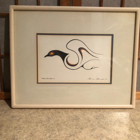 Kanadan alkuperäiskansan taidetta. Clemence Wescoup ”Mother Bird spirit” litografia 1978. Woodland School tyylisuunnan litografia.