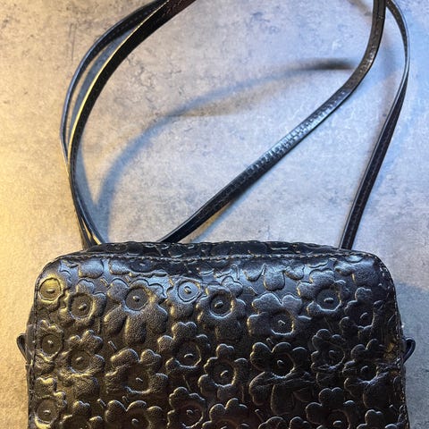 Tämä nahasta valmistettu, Unikko-kuosilla kohokuvioitu Marimekon Nerva käsilaukku sulkeutuu vetoketjulla, siinä on säädettävä olkahihna ja sisällä vetoketjutasku. Marimekko nahkalaukku.