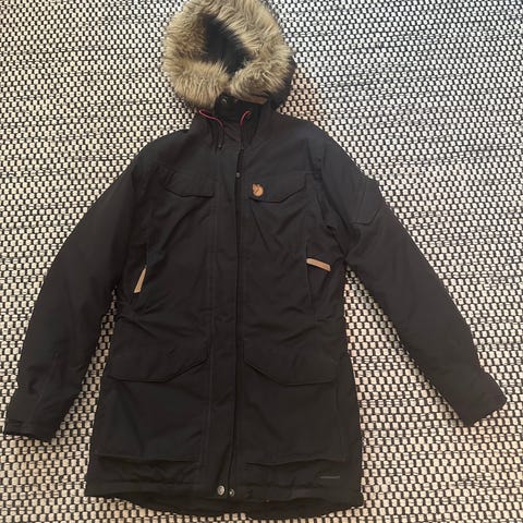 Fjällräven S kokoinen takki. Huomasin kuvaushetkellä takissa tahran. En ole yrittänyt poistaa. Muuten takki on hyvässä kunnossa.