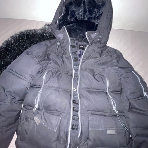 Myydään yhden talven kohtuukäytöllä ollut s koon Suoply & Demand toppatakki kiiltävää mustaa kangasta.
