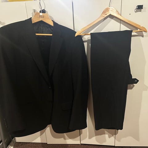 Miesten tumma puku Turo Tailor Basie SD 116, vastaa noin kokoa 58. Housujen sivusauma 102 cm, sisäsauma 73 cm. Takin mitat: hartiasaumasta toiseen hartiasaumaan 50 cm, takapituus 82 cm, kainalosta toiseen noin 65 cm. 55% polyesteria, 45% villaa. Kemiallinen pesu. Pesty. Kokotaulukko: https://www.turoshop.com/products/navy-blue-vitale-barberis-wool-suit?srsltid=AfmBOopL1iJ3T6NG9j7wmGQfkAxkcw9DBz7K1ZXcgJFnbUUcJQJDtcDy