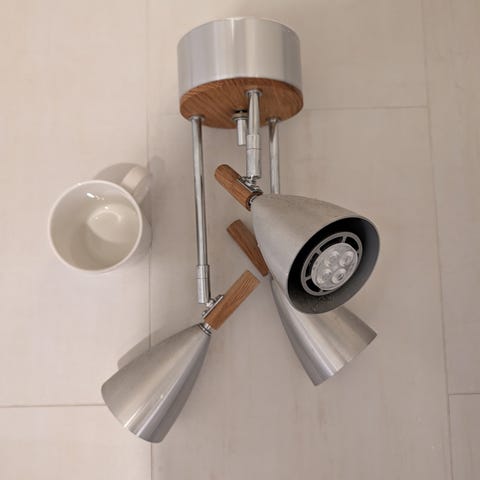 Musta kangaspäällysteinen iso lampunvarjostin ja osin metallinen ripustinsarja sokeripalakiinnityksellä. Molemmat Ikeasta. Varjostin on iso, yläpään halkaisija n 43 cm, alhaalta n 55 cm.