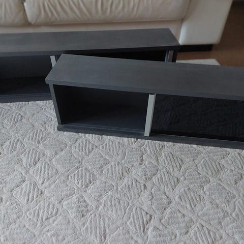 Rapiat kaksikymmentä vuotta vanhat hyllyt eivät löytäneet enää paikkaa uudessa kodissa. Hyllyissä on takana maalitahraa sekä skraiduja osassa päältä ja alta sekä päädyssä. Yleisilme siisti. Tummat lasilevyt liukuu suht nätisti puolelta toiselle.