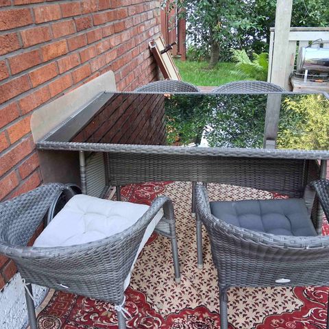 Polyrottinkiset Jutlandia-terassikalusteet. Musta polyrottinki runko, lasinen pöytäkansi ja harmaat pehmusteet. Ryhmä sisältää pöydän, sohvan ja kaksi tuolia, joissa on irrotettavat istuin- ja selkätyynyt. Soveltuu ulkokäyttöön tai parvekkeelle.