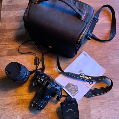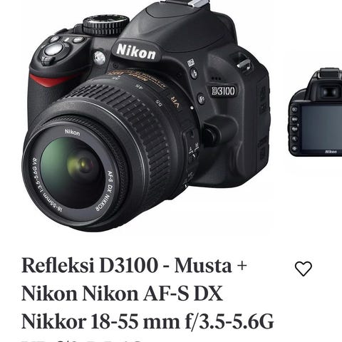 Nikon D600 järjestelmäkamera, musta väri, sisältää objektiivin. Kamera on suunniteltu valokuvaukseen ja videokuvaukseen. Varustettu LCD-näytöllä ja useilla säätimillä helppoon käyttöön.