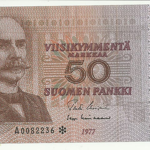 Myynnissä kuvan mukainen 50 markan seteli vuodelta 1977. Kyseessä on harvinaisempi ns. tähtiseteli (tarkoittaa, että sarjanumeron perässä on "tähti"). Tähtiseteleitä tehty tästä setelimallista aikoinaan vain 216 000 kpl.
