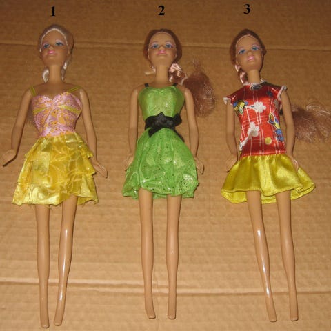 Barbi tyyliset nuket, barbin kengät ei sovi, vaatteet sopii.