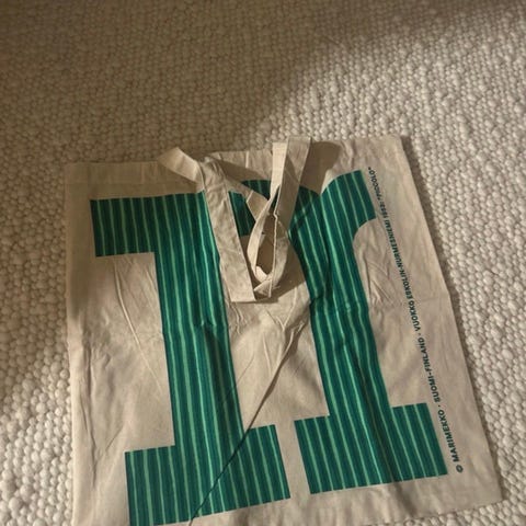 Marimekko kangaskassi. Kangaskassi on valmistettu puuvillasta ja siinä on Marimekon tunnistettava kukkakuosi, jossa on punaisia kukkia ja mustaa tekstiä luonnonvärisellä pohjalla.