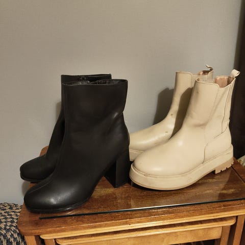 Käytetty parin viikon ajan, oikeassa kengässä pieni repeämä (kuva). Materiaali keinonahka.