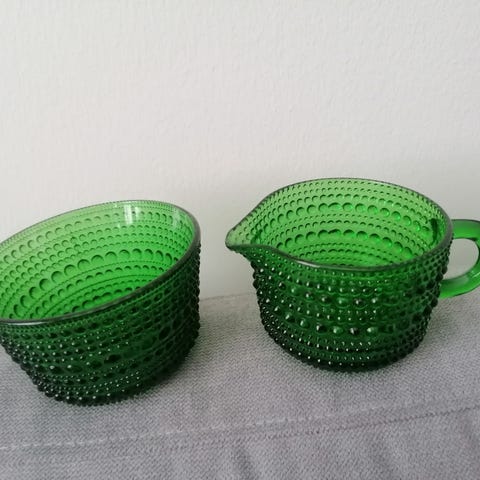 Myydään kaunis Nuutajärven Kastehelmi -sarjan sokerikko ja kermakko kirkkaasta lasista.