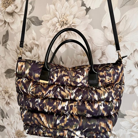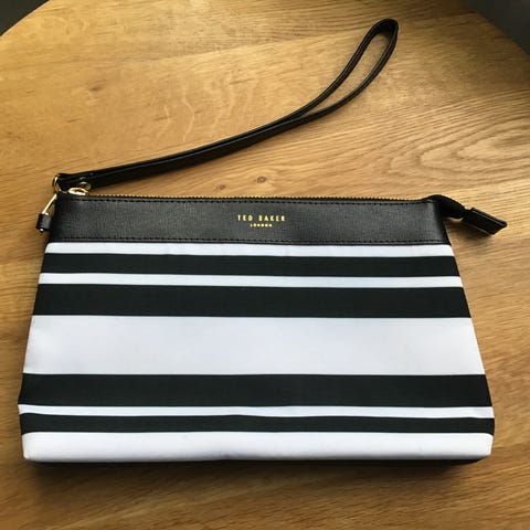 Musta, iso, kiiltävä ted baker laukku, ei tietääkseni ole aito. Jonkin verran pinnassa ja pohjassa pieniä, aika huomaamattomia naarmuja. Muovia.