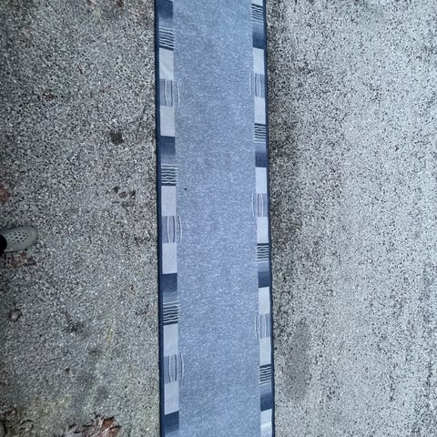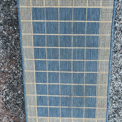 Sininen matto, koko 200x80 cm. Maton reunat ovat vaaleat. Materiaali ei ole määritelty.