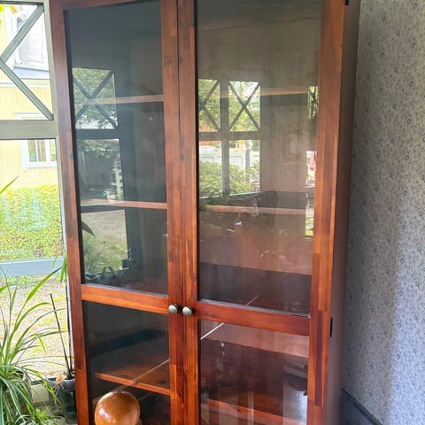 Hieno, erikoinen kaappi lasiovilla. Sopii keittiökaapiksi tai vaatekaapiksi. Vaatii purkamista osiin että saa ulos talosta. Hyvässä kunnossa, löytyy myös loisteputkivalo kaapin sisältä. Loisteputki täytyisi vaihtaa muuten toimiva. Ollut aikoinaan kiinni toisessa kaapissa joten pienet jäljet vasemmalla puolella.
