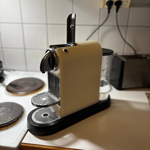 Hyvässä kunnossa! Myyn ainoastaan sen takia että hankin espressokoneen, joten tällä ei ole enää käyttöä. 80€ uutena. Sinne menee podeja, näkyy viimeisessä kuvassa millaisia.