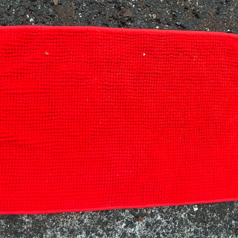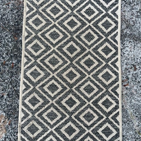 Sininen ja beige matto, jonka koko on noin 80 cm x 50 cm. Materiaali ei ole tiedossa. Matto soveltuu sisäkäyttöön.