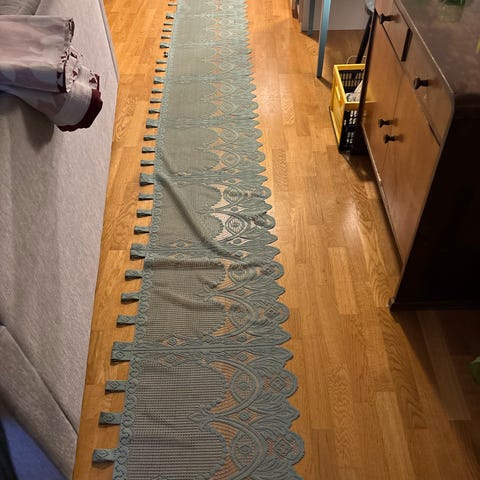 Pitkä 344 cm x 56 cm kappa pihlajanmarja kuviolla. Samasta kankaasta löytyy myös pyöreä pöytäliina halkaisija 160 cm. Nouto Espoon Olarista.