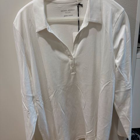 GerryWeber pitkähihainen trikoopaita lehmuksen väristä viskoosielastaania. Koko 46, mitat venyttämättä kai-kai 63cm, helman leveys 73cm, olka-helma 77cm. Jujuna edessä korukivin koristeltu kolmio. Erinomainen kunto. 12e.