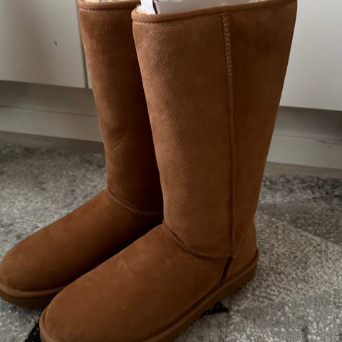 UGG Classic Tall talvikengät, koko 41, musta väri. Päällinen on lampaannahkaa, vuori on puhdasta villaa ja pohja on synteettistä materiaalia. Kengät soveltuvat kylmiin olosuhteisiin ja tarjoavat lämpöä käyttäjälleen.