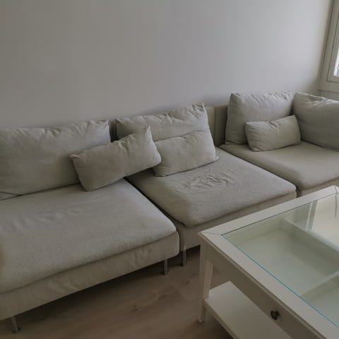 Sekä sohvan että tyynyjen päälliset on pesty ja puhdistettu – sohva on siis heti käyttövalmis uudelle omistajalle.