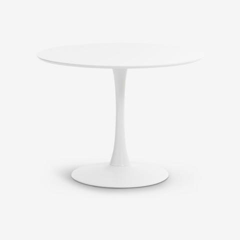 Siistikuntoinen kiiltävä valkoinen ruokapöytä tukevalla teräksisellä jalalla.