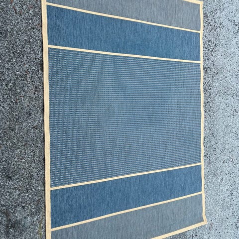 Sininen ja valkoinen matto, koko 130x200 cm. Maton materiaali ei ole tiedossa. Soveltuu sisätilojen lattialle.