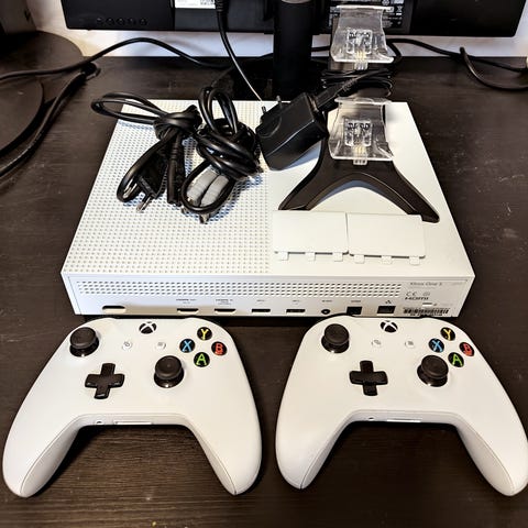 Xbox One pelikonsoli valkoisella värillä. Sisältää ohjaimen. Konsoli soveltuu Xbox One -peleihin ja tarjoaa viihdekäyttömahdollisuuksia.