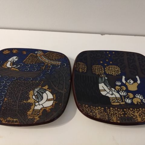 Heljä Liukko-Sundströmin suunnittelemat kevät, kesä ,syksy ja talvi seinälautaset. Arabia 1990 ostettu. Voi kiinnittää seinälle. Tsuluissa lanka takana. Koko 11cm x 11cm paksuus 17mm.