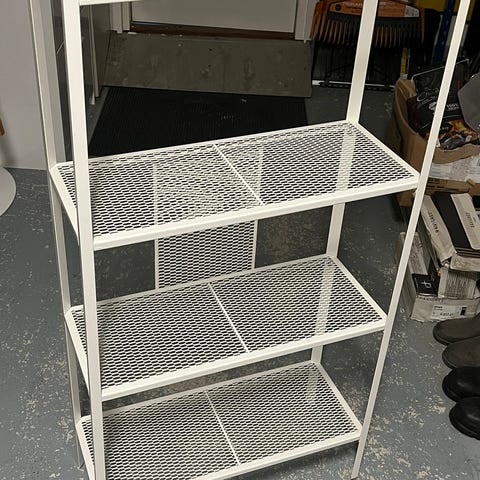 Metallinen hyllykkö, jossa neljä mustaa tasoa. Sen rakenne on metallia ja väri musta. Hyllyt irrotettavissa. Vain haku.