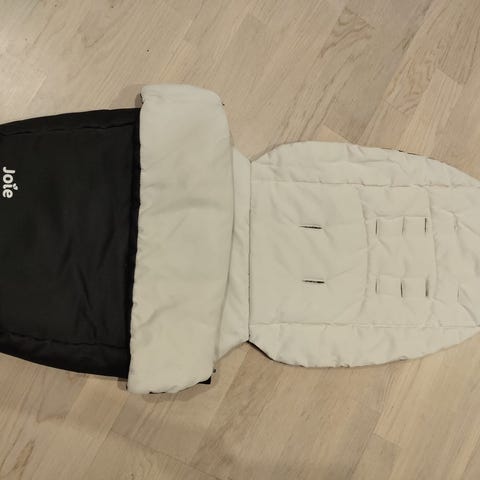 Joolz merkin lämpöpussi rattaisiin. Takana aukot, joista saa rattaiden valjaat läpi. Meillä pussi oli käytössä vauvavuonna ennen kuin lapsi oppi kävelemään, joten tätä ei ole käytetty mutaisilla kengillä 😊