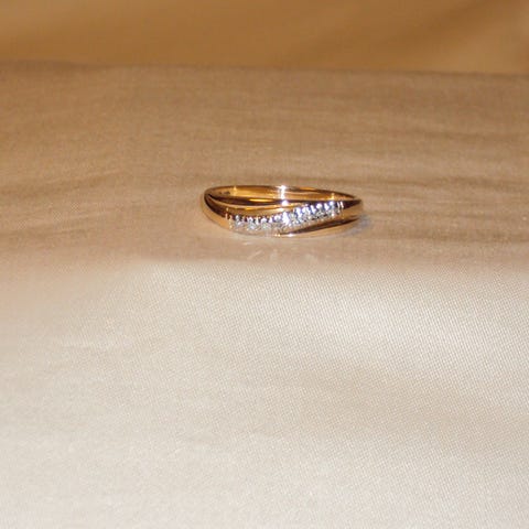 11 timanttia ( 11 x 0.01 ct ), leveys päältä: 2.5 mm, leimat: 585, valmistajan leima.