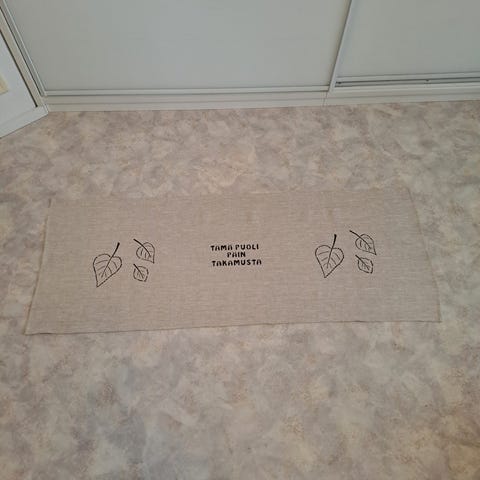 Kirjailtu pellavaliina seinätekstiili tekstillä Varjele Jumala kotiamme. Koko 40x66 cm.