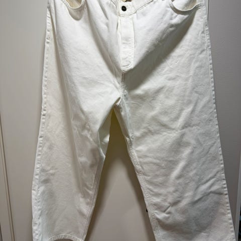Nanson Suora-mallin mustat farkut, koko 38. Musta väri täysin kulumaton (valokuvien valotuksen luomasta näkymästä huolimatta), suorat lahkeet. Muutaman kerran kokeiltu pitää jalassa päivällä mutta todettu liian lyhyiksi omiin pitkiin jalkoihin. Ei pesty kertaakaan, kunto kuin uusi.