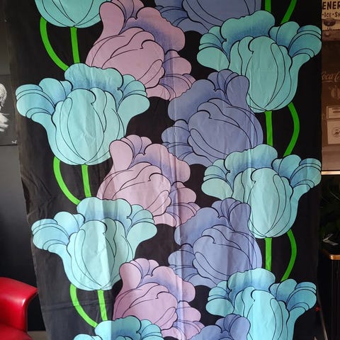 Tämä puuvillakangas sopii verhoksi tai pöytäliinaksi. Päät ommeltu.