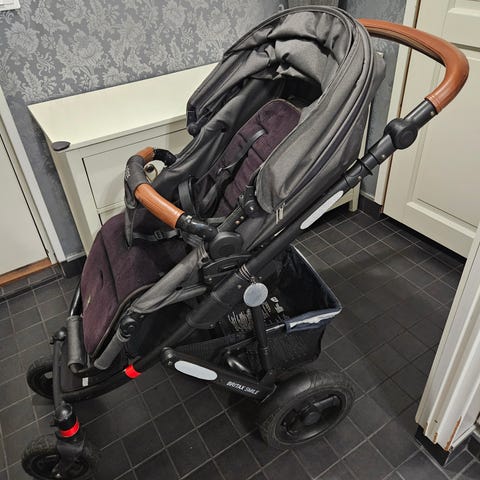 Ratasosa ja vaunukoppa. Mukaan myös erilaisia suojia. Voin laittaa kopasta ja suojasta kuvia erikseen. Lämpimässä säilytetty. Runkoon liimattu pimeässä heijastavaa nauhaa.