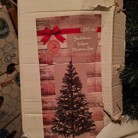 Siisti vielä valmiiksi kasattu muovikuusi jalalla. Pakettia ei enää ole. Pitää siis kuljettaa sellaisenaan tai tuoda jätesäkki kun hakee. Hyvä kunto.
