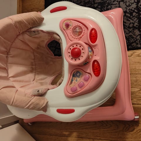 Kuvan kävelytuoli seuraavalle pikkuiselle 🩷🩵🩶 Helpotti meillä kovasti arkea vauvan kanssa, joka ei vielä itse osannut kävellä, mutta menohaluja oli hurjasti. Tuolin saa taitettua kätevästi kasaan, joten se on helppo ottaa mukaan myös reissuun. Istuinosan kangas/pehmuste on irrotettava ja pestävä. ”Leikkikeskuksen” saa irti ja sitä voi siis käyttää myös erikseen. Alta paljastuvaa pöytää voi halutessaan käyttää esim. syömiseen.