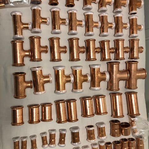 Erilaisia kupariputkiliittimiä ja kulmia eri kokoja, kaikkiaan n. 200 kpl. Materiaali kupari, messinki ja rst teräs. soveltuu putkiasennuksiin ja korjauksiin.
