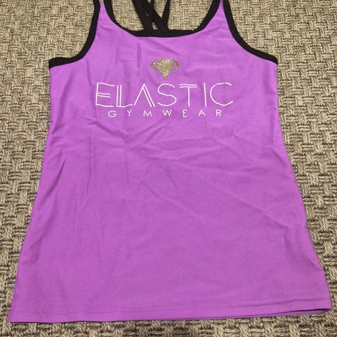 Elasticin violetti ristikko-olkaintoppi 160cm. Helman ompeleessa takana lamgannousu (kuva), logossa pientä murtumaa joissakin kirjaimissa.