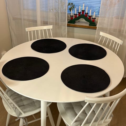 Tuolit ei mahdu kokonaisena pöydän alle, joten ruokailuryhmä tarvitsee tilan ympärilleen. Tarvittaessa voin myydä tuolit erikseen.