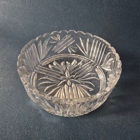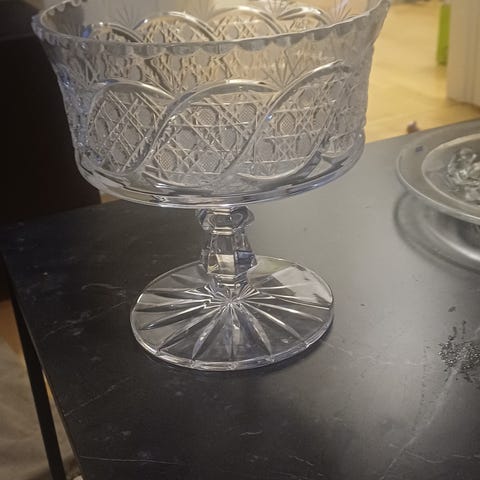 Kaunis kristallikulho matalalla jalkaosalla. Korkeus n. 7,2 cm ja suuaukon halkaisija ulkomitoin n. 12,5 cm.